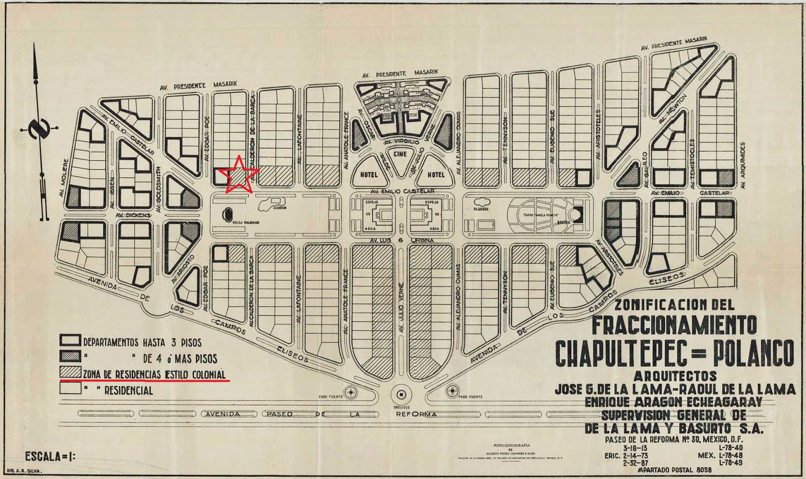 Arriba, el “Plano de zonificación del fraccionamiento Chapultepec-Polanco”, que agradezco a Alejandro Leal y en el que he marcado el predio. El matrimonio Domit/Gemayel adquirió un magnífico terreno con superficie de casi 800 m², con frente sur de treinta metros y cara al parque del fraccionamiento -justo frente al “Reloj-Palomar” que Enrique Aragón Echegaray había diseñado para hermosear el sitio, y con vista al lago en cuyo centro se había forjado una “Isla con Acuarium”-, con una zonificación que claramente indicaba que la edificación debía respetar la norma de “Zona de Residencias Estilo Colonial”, estilo en boga en ese momento…